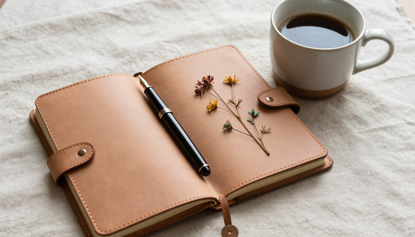 린넨 천 위에 놓인 펼쳐진 가죽 수첩과 만년필, 말린 꽃과 세라믹 커피잔이 어우러진 감성적인 데스크테리어 모습.